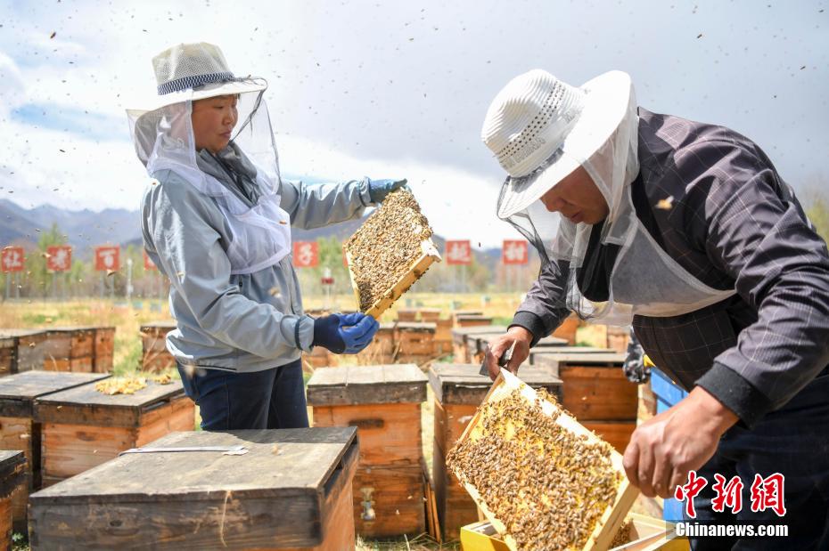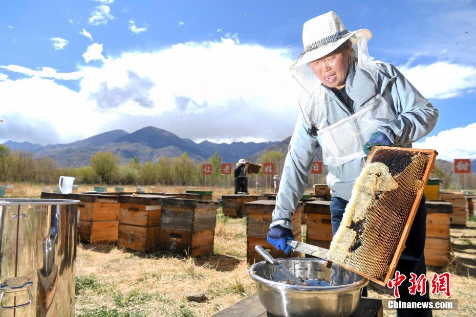On May 28, in a beekeeping base in Konggar County, Lhoka City, Tibet Autonomous Region at an altitude of 3,650 meters, a staff member is collecting honey. It is reported that the beekeeping project is a brand-new project incubated and promoted by the ninth batch of aid-Tibet team of Changsha, Hunan Province. The project started in May 2020. At present, the No. 1 Honeycomb Complex, Transparent Factory, Sunshine Restaurant and eight bee-breeding demonstration bases have been completed, creating jobs for 358 local people, and the first-year sales after production reached 8 million yuan.