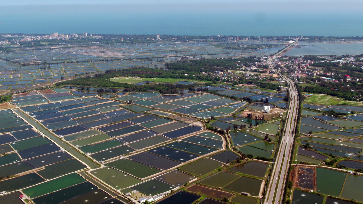 Seen from the sky, the fish and shrimp breeding base in Jiangping town, Dongxing city in the Guangxi Zhuang autonomous region, is a color palette, crisscrossing and extending all the way to the sea.